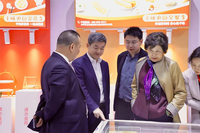 展會期間,中國烹飪協會會長楊柳前往展位參觀,孫劍熱情接待,楊柳會長對千味央廚的高質量發展給予高度肯定。