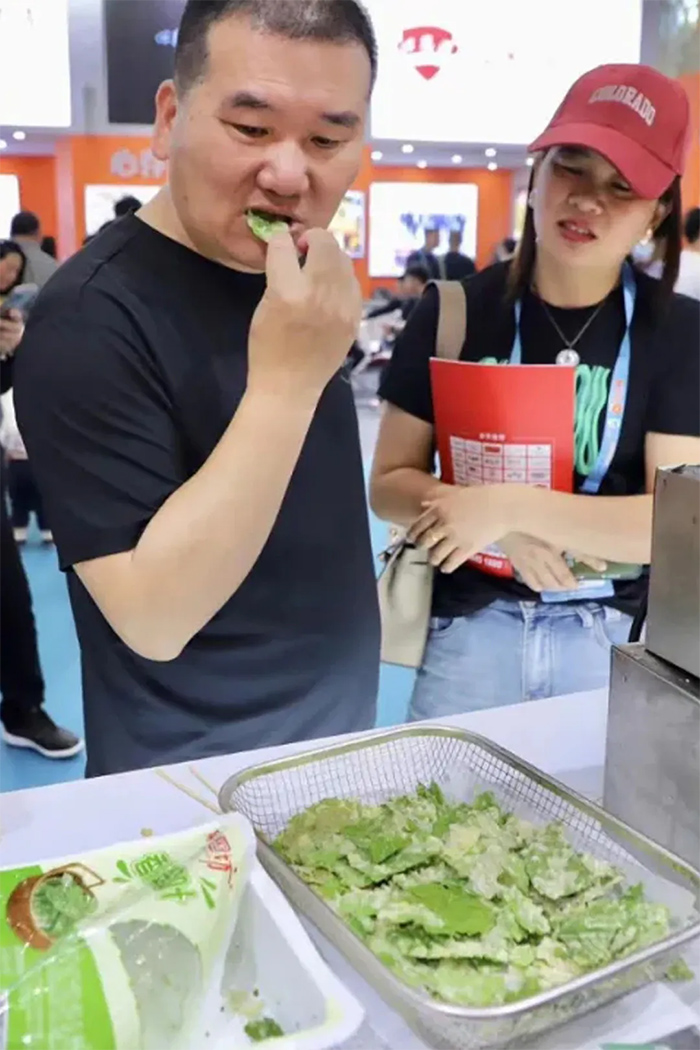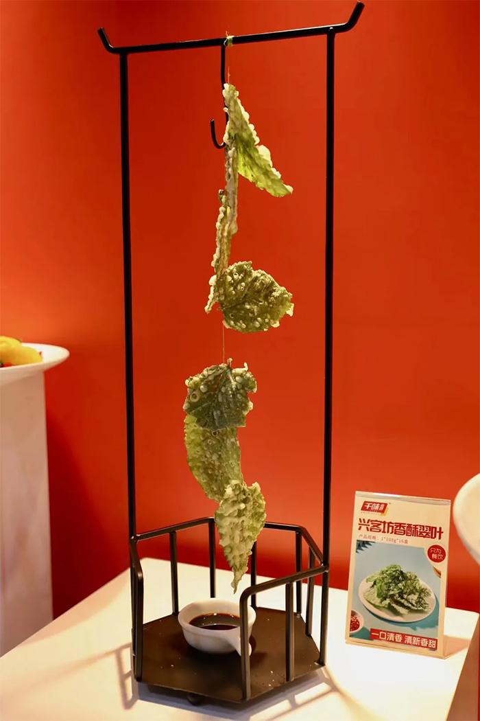 翠葉原料成了現場的新寵兒,酥脆可口,12秒快速出餐,作為一道快手健康美味俘獲不少食客的心。千味央廚翠葉采用桑葉中的一個品種——“蛋白桑”,蛋白含量高達到36%,供應穩定,為餐飲酒店、融合餐飲等場景增添一道春色美味。蝦滑以北海大蝦為原料,大顆粒設計,一袋蝦滑由25只蝦制成,吃起來滿口蝦感更盡興,主要面向火鍋餐飲。